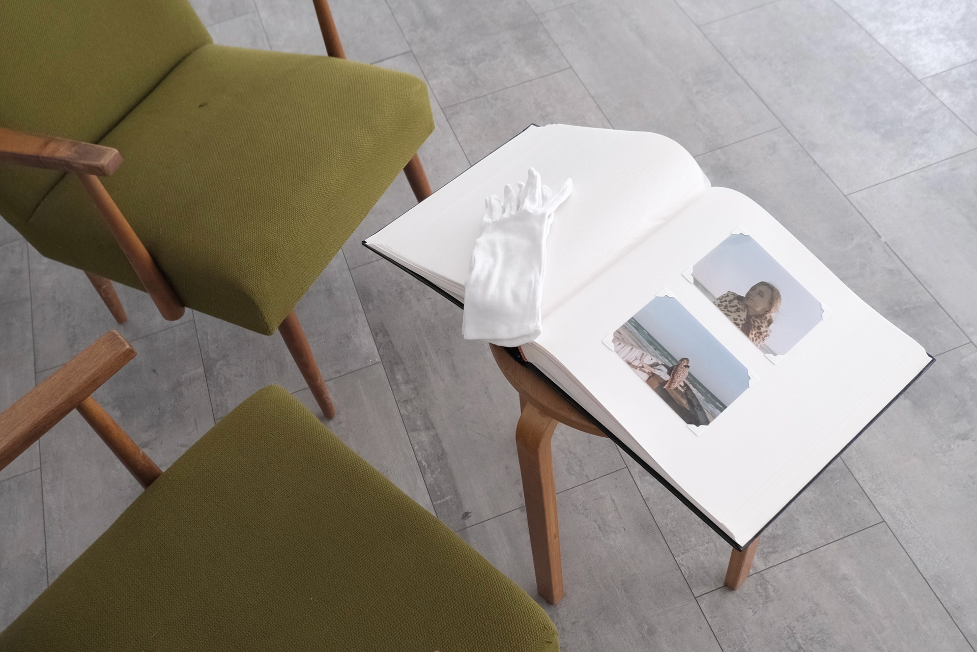 The artist creates her own “archive” by using an old photo album, into which she inserts photographs taken by her husband in the Kherson region in 2020, but accidentally developed only in 2025. A special dimension of the work emerges through the surreal nature of the discovery: photographs taken five years earlier appear in the present, as if messages from another temporal reality. In this way, the artist engages with the paradox of the presence of the absent — when real images become evidence of what has already disappeared.