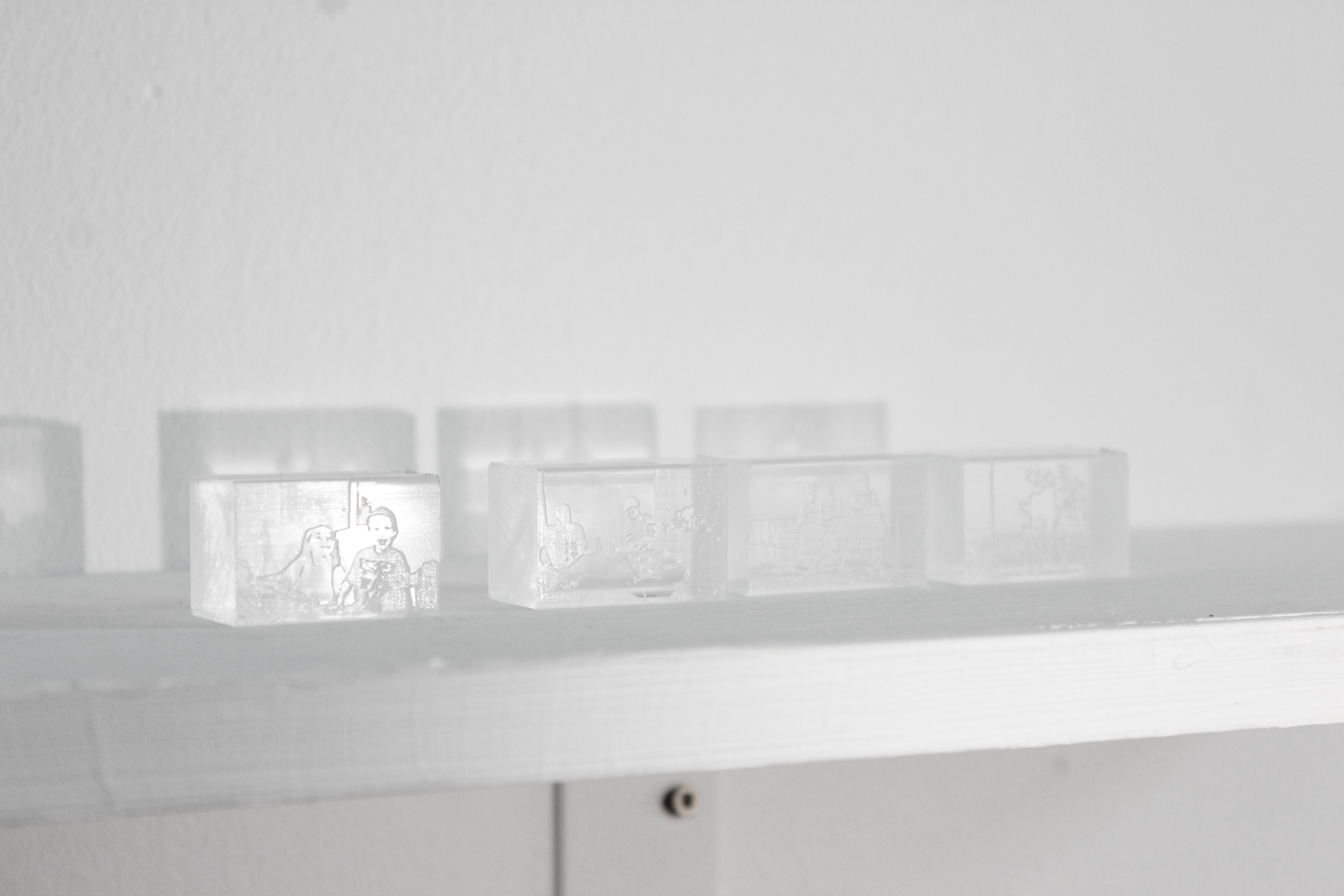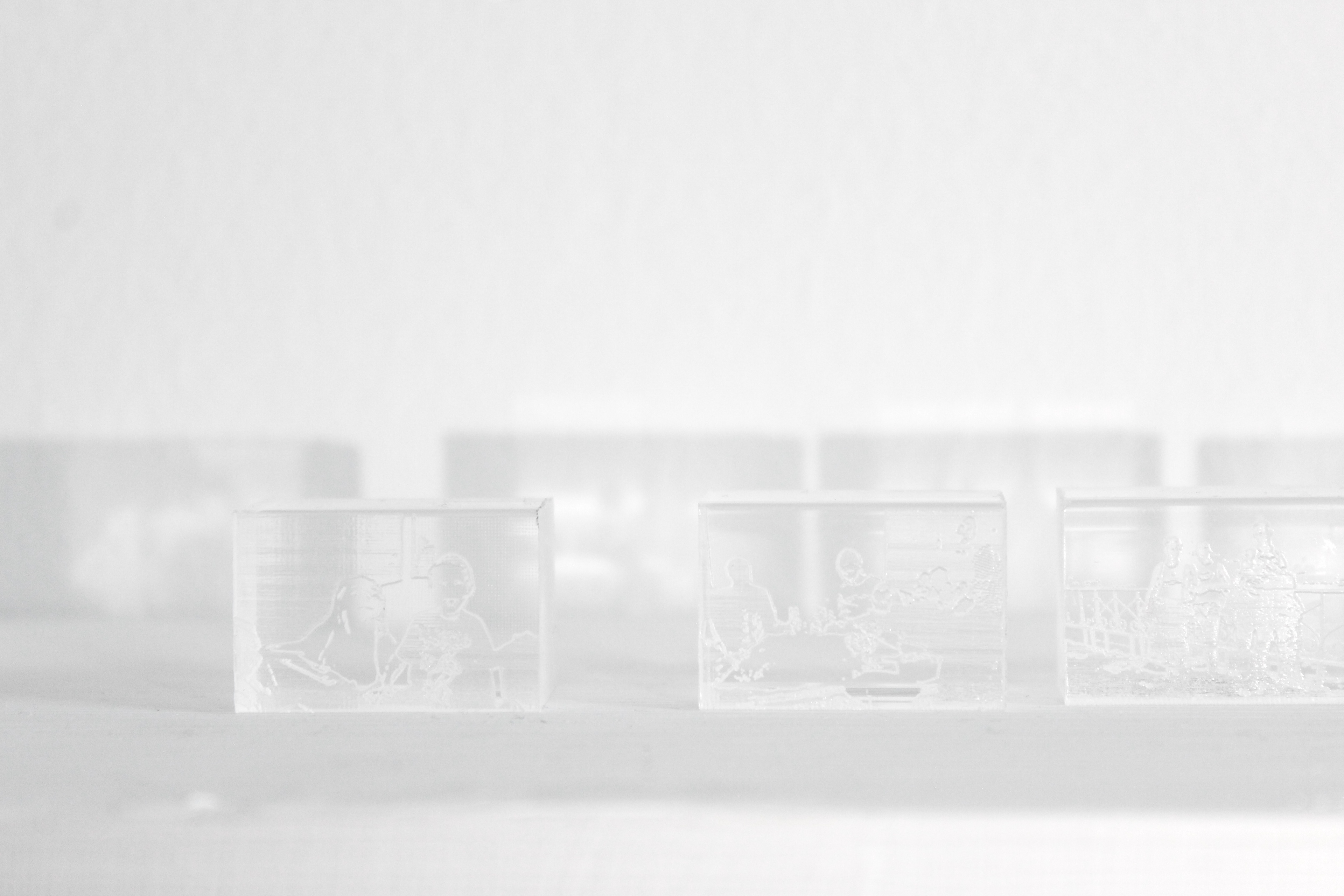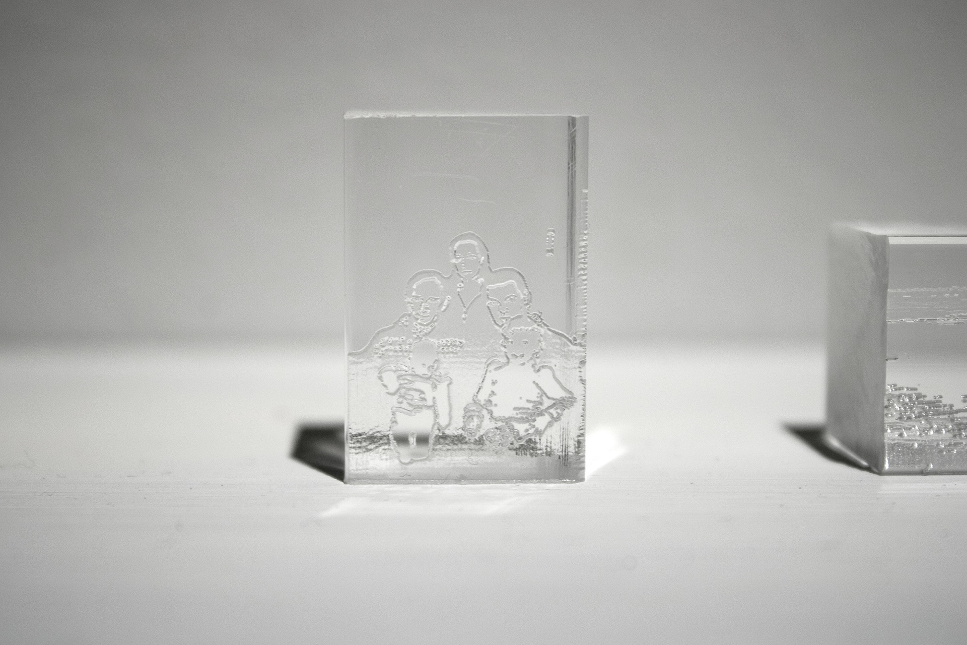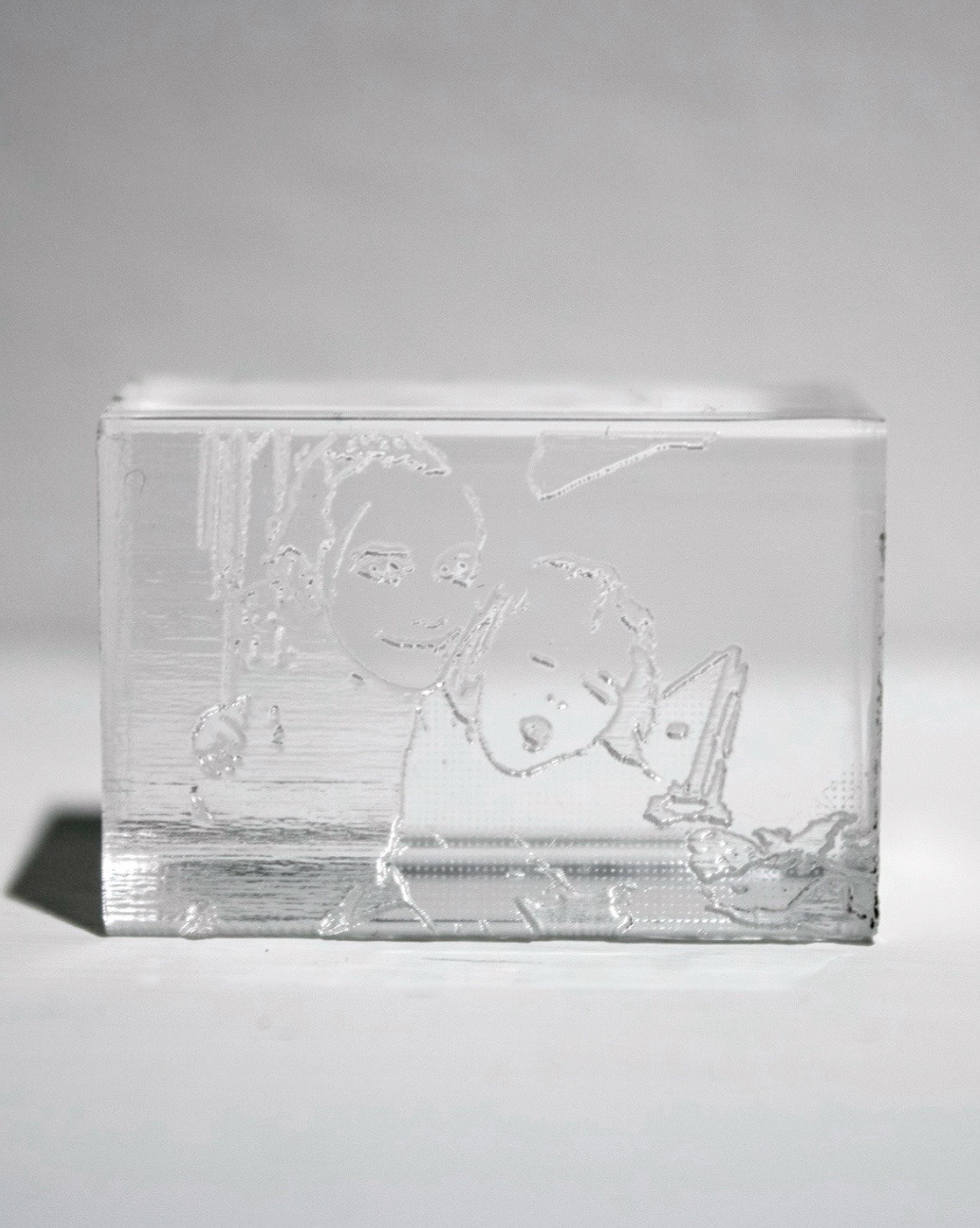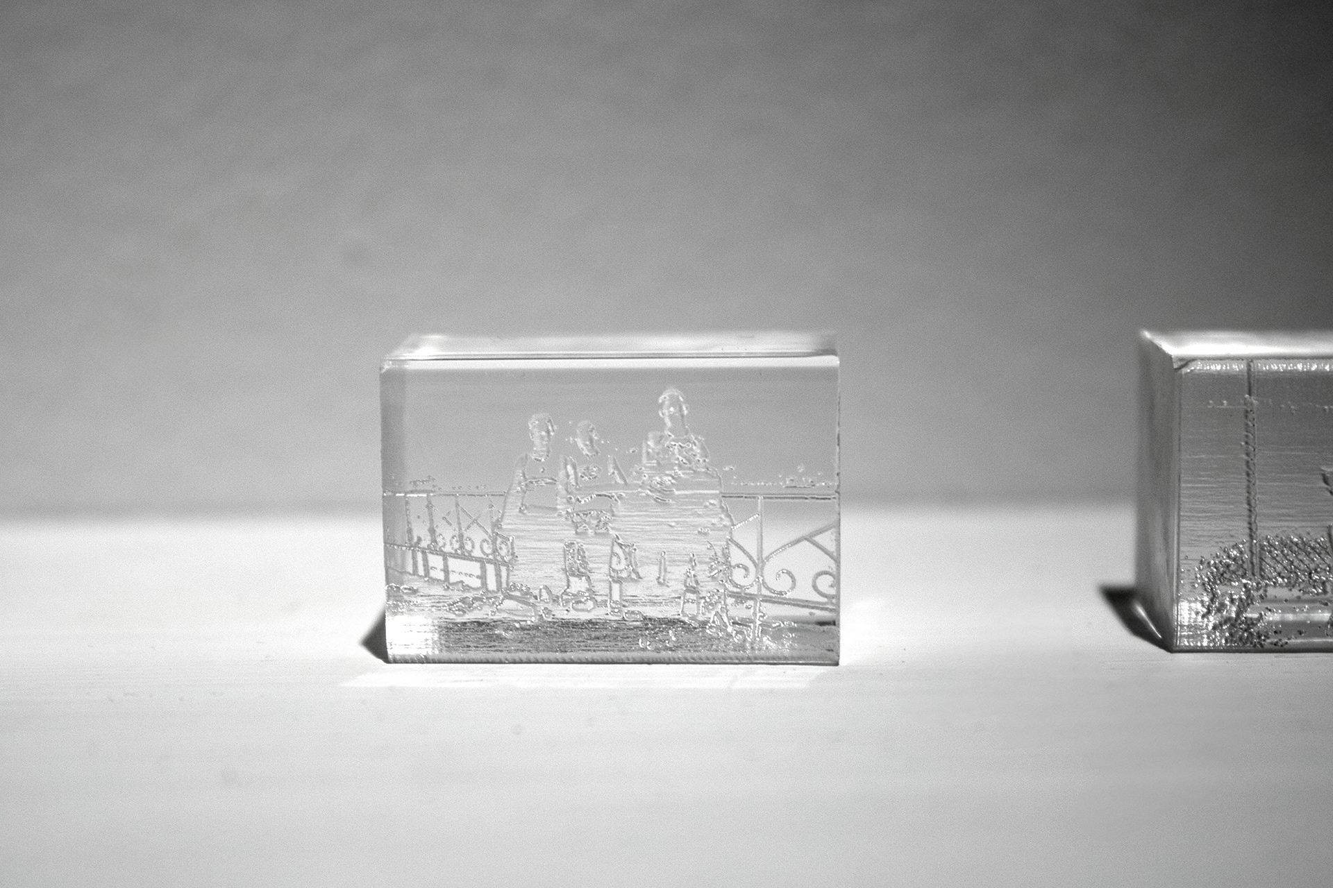 Fragments of acrylic glass are engraved with photographs from the artist’s family archive, which today exists only in digital form: the physical photo albums and the places where the images were taken remain in the occupied territory of the Kherson region and are inaccessible.