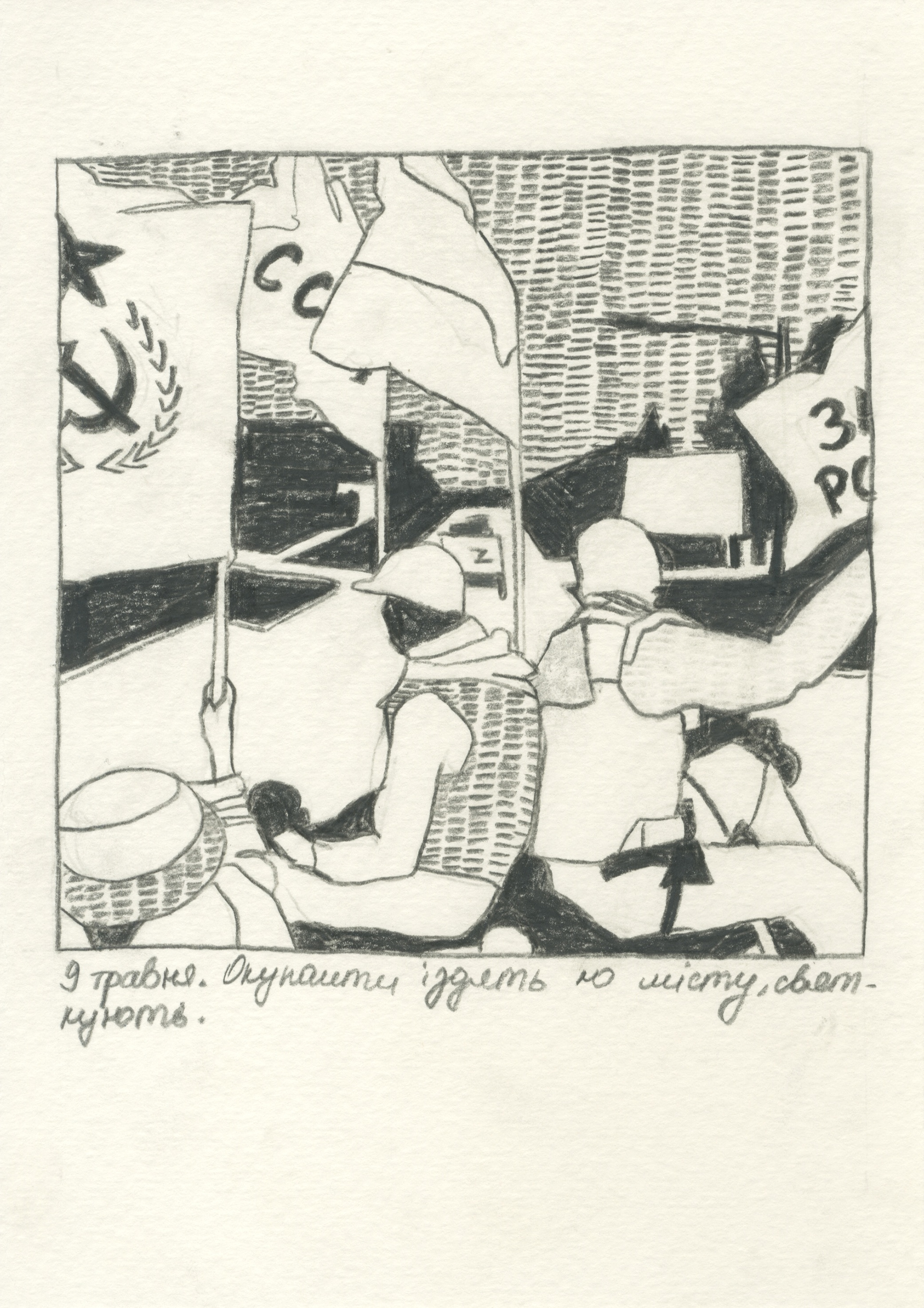 The author uses the example of her hometown to show life under occupation, and the example of her family to show the everyday side of this life. The project highlights two sides of life under occupation - the political one (which includes everything that can be seen in the news, local groups, the consequences of the war, the remains of shells and military equipment, the introduction of the ‘Russian’ peace, etc.), and the everyday one (which depicts people's daily lives, their new way of life, habits, rules, adjusting to new circumstances and conditions). The main idea was also to show that people never see the flip side of any event - people's lives - when watching a news feed.